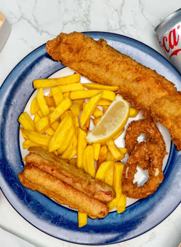4 x Flakes, 4 x Tempura Squid Rings, 4 x Crab Sticks, 4 x Scallops, 4 x Crumber Prawns, 1 x Chips and 1 x 1.25L Drink.